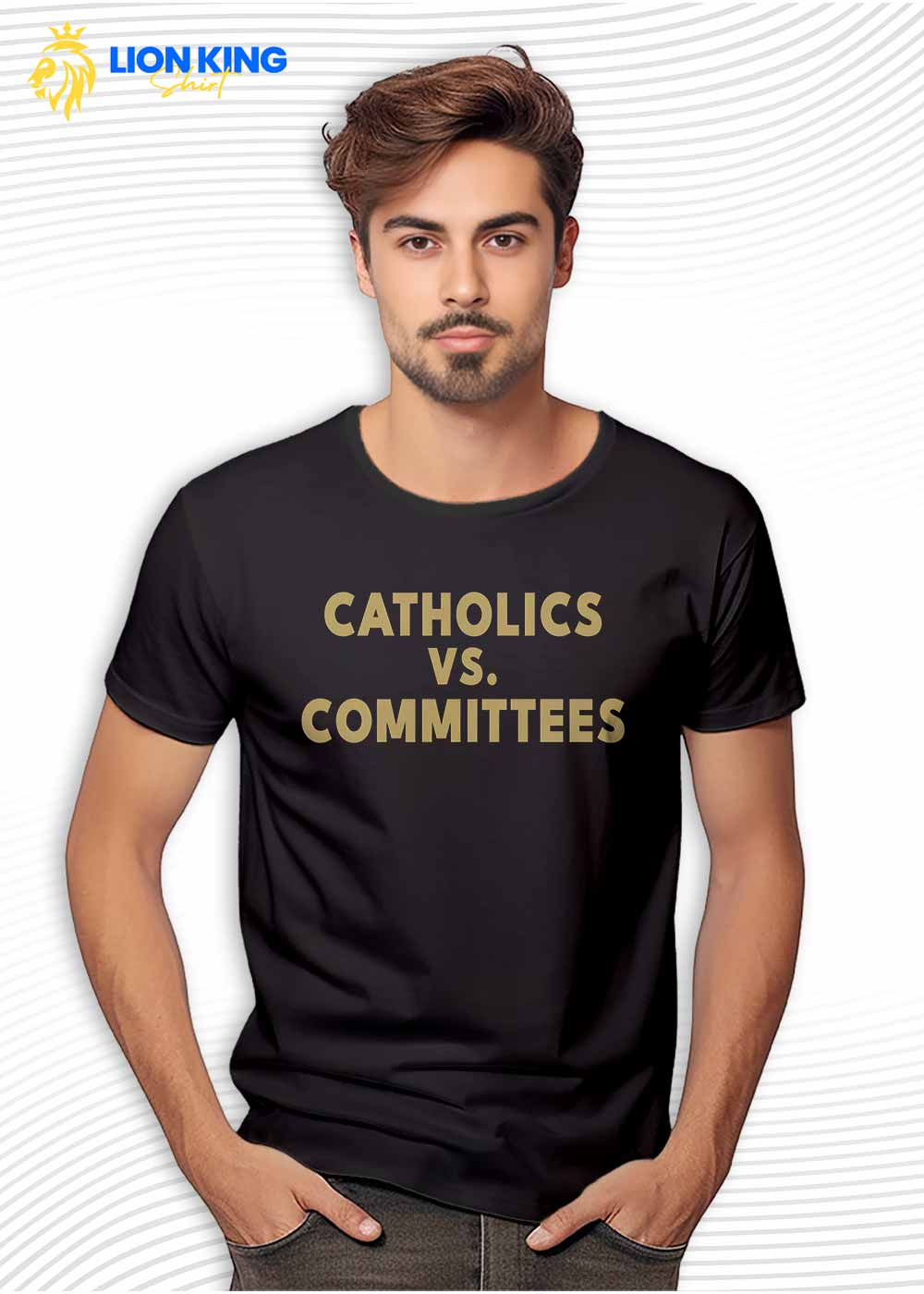 Skip waiting for next week’s headache-inducing reveal. Put the humor on fabric, walk in, and own the room. Nab the Catholics Vs Committees Gold Font Shirt today and let LionKingShirt help you speak fluent satire–straight from the chest.