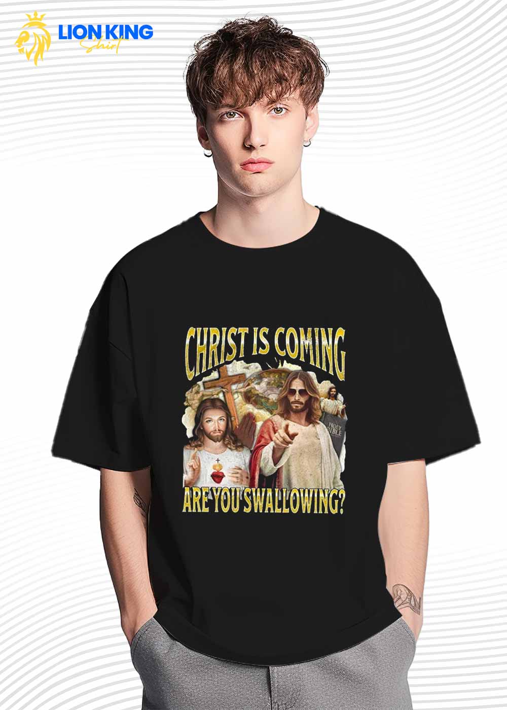 If you grew up around church talk but now scroll memes and dark humor, this Christ Is Coming Are You Swallowing Shirt from LionKingShirt hits your sweet spot. It looks almost innocent, then the meaning flips and people freeze and laugh. One line turns a hangout into a shared joke.
