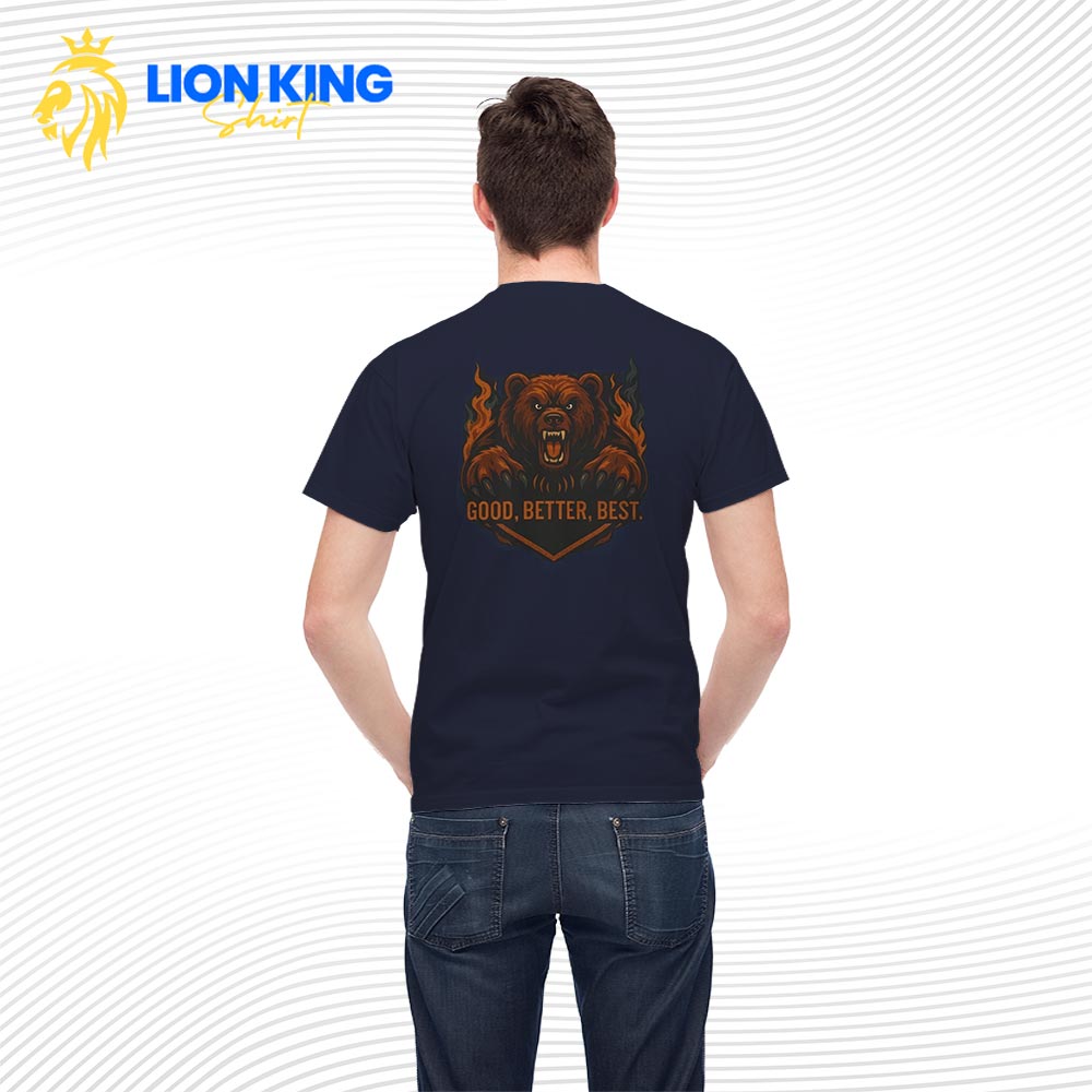 Turn around and the back becomes the main event. The flame bear gives you that walk-away moment in line, at the bar, or in a group photo. The “Good, Better, Best” line reads like a standard, not a throwaway phrase.