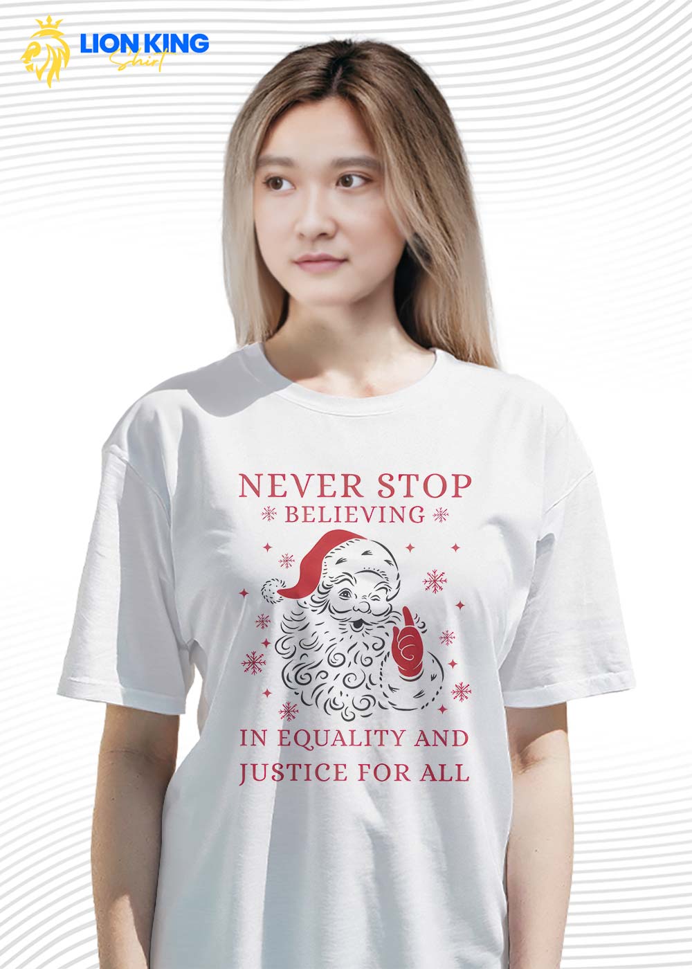 Never Stop Believing in Justice For all Santa Christmas Shirt is fabric, yes, but also a passport to better conversations. Suit up, brighten December, and let the message echo long after the pine needles vanish. Thanks for choosing LionKingShirt to keep the talk alive.