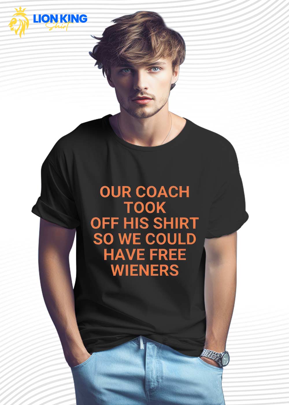 The moment a win detonates and every phone in the group chat lights up, you need a line that carries the noise for you. Our Coach Took Off His Shirt So We Could Have Free Wieners Shirt does it in one punch. Part goofy football meme, part classic Chicago-style hot-dog gag, it lets LionKingShirt send you into game day armed and already laughing.