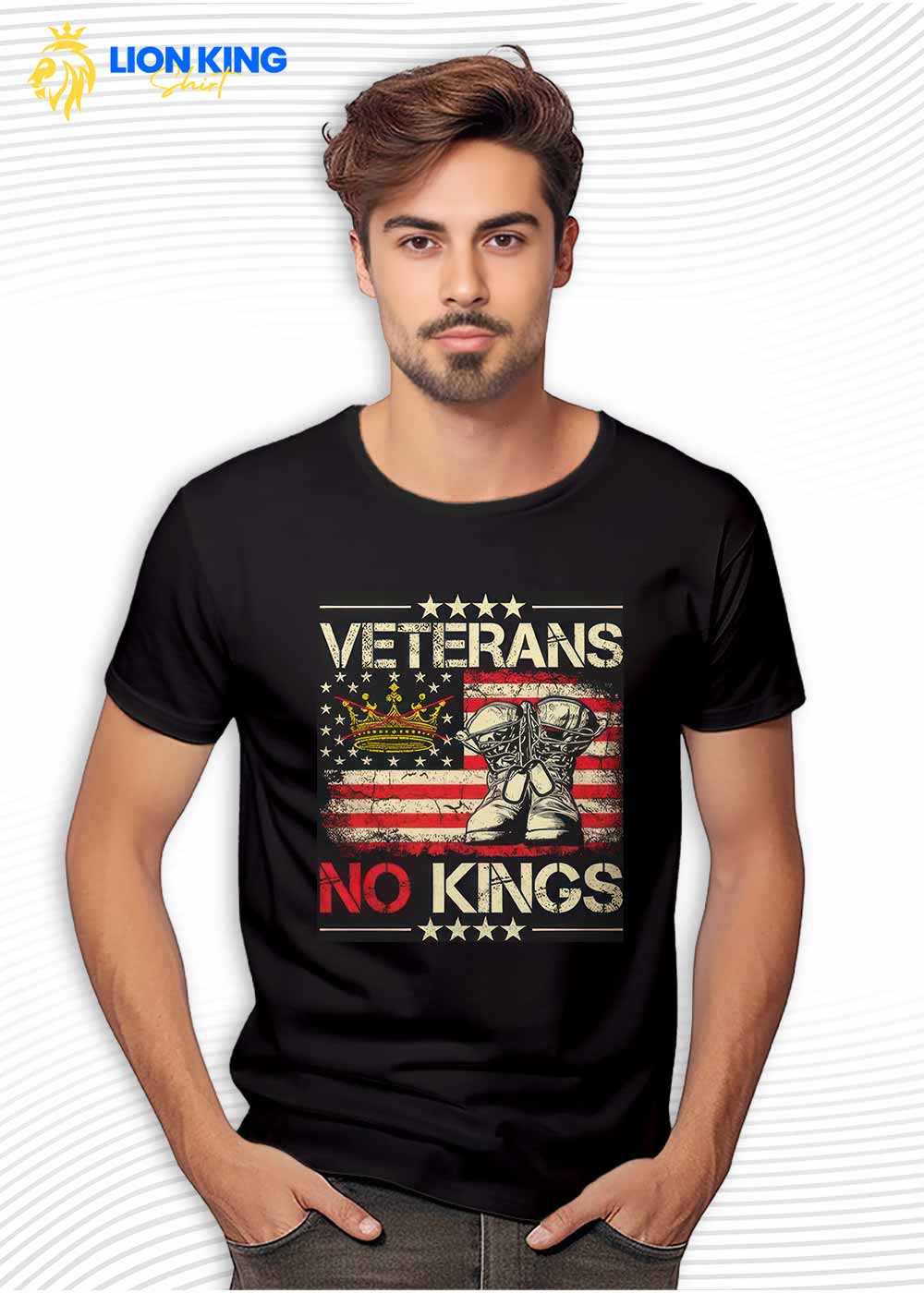 The Veterans No Kings Military Protest Shirt says what it means, then lets the art breathe. A crossed crown, a grunge flag, a pair of worn boots–simple icons that carry weight. The tone is steady, not angry. Built for daily wear, this statement piece from LionKingShirt reads at a glance and invites conversation without raising voices.